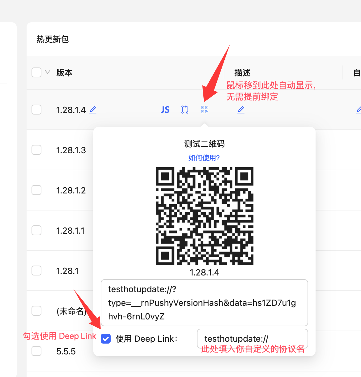 勾选使用 Deep Link选项,在后面的输入框中填入你自定义的协议名,在二维码刷新后,即可在设备上直接使用系统相机或扫码功能(注意不能使用微信扫码)来扫描,即可自动触发热更检查功能。